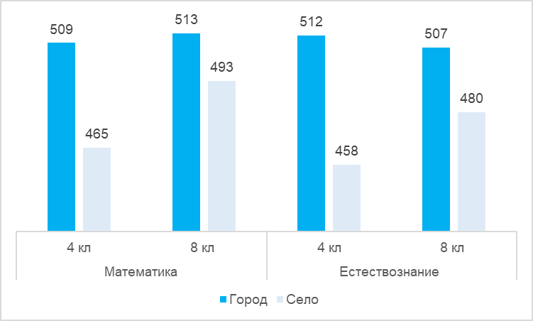 Определенная зависимость прослеживается и от типа населенного пункта. Городские четвероклассники и восьмиклассники демонстрируют наиболее высокий балл как по математике (509 и 513), так и естествознанию (512 и 507). Школьники, проживающие в сельских населенных пунктах, показывают самые низкие результаты.