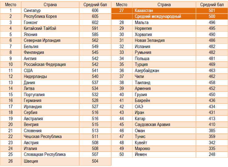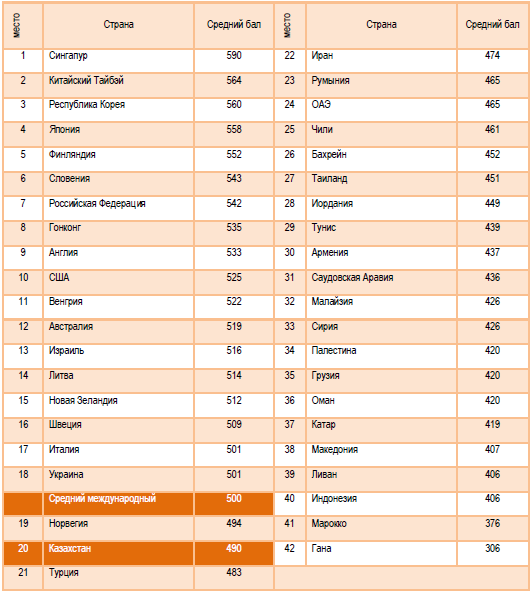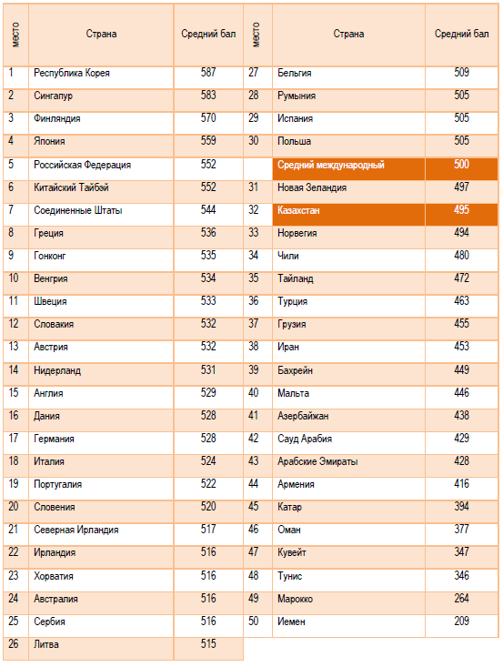 Результаты учащихся 8-х классов Казахстана, принявших участие в исследовании впервые, сопоставимы с показателями Новой Зеландии и Швеции. Самые высокие результаты продемонстрировали учащиеся Республики Корея, Сингапура и Китайского Тайбэя, Гонконга и Японии.